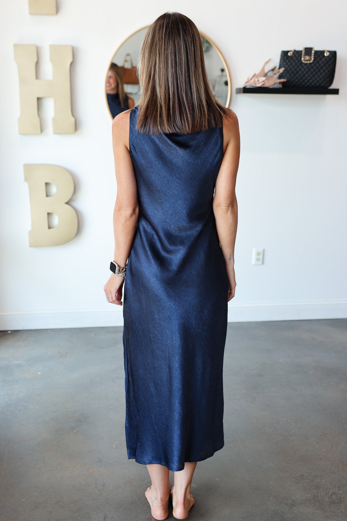Cowl Neck Satin Midi Dress - Navy