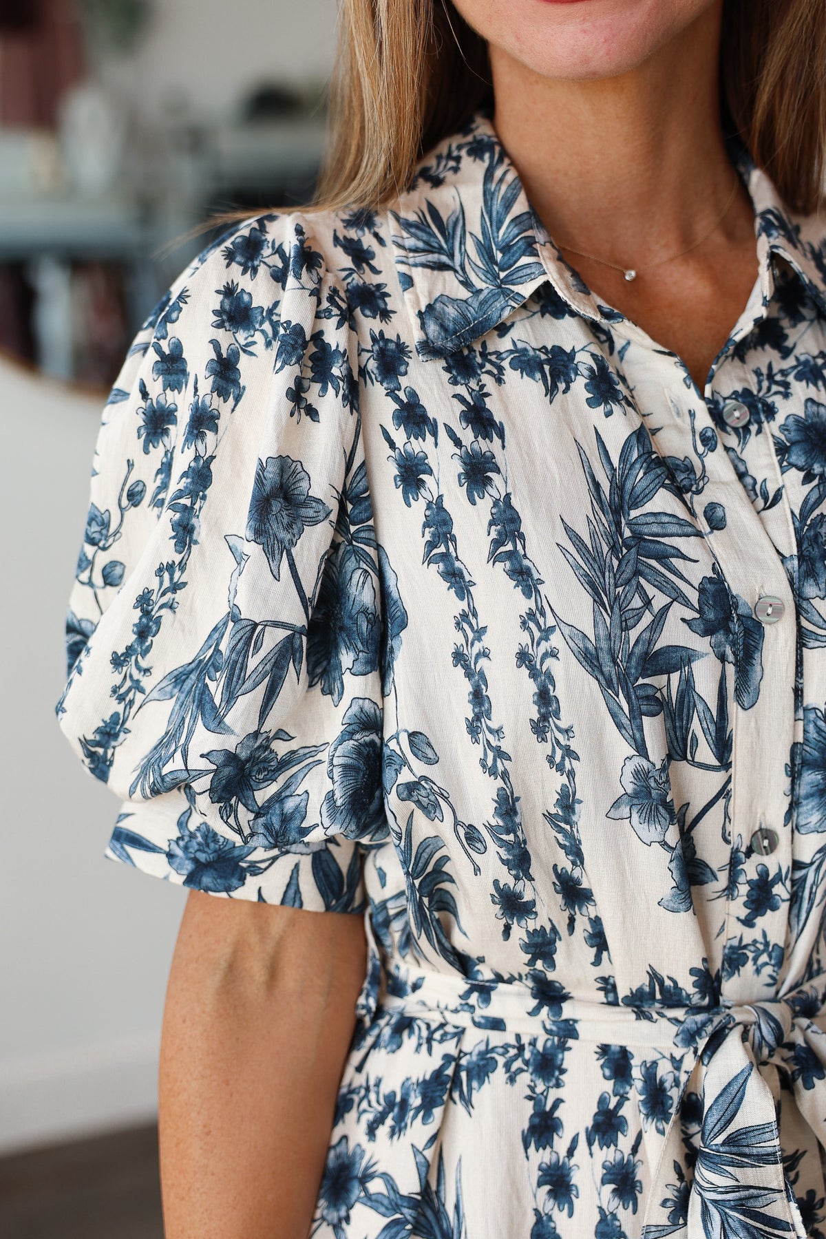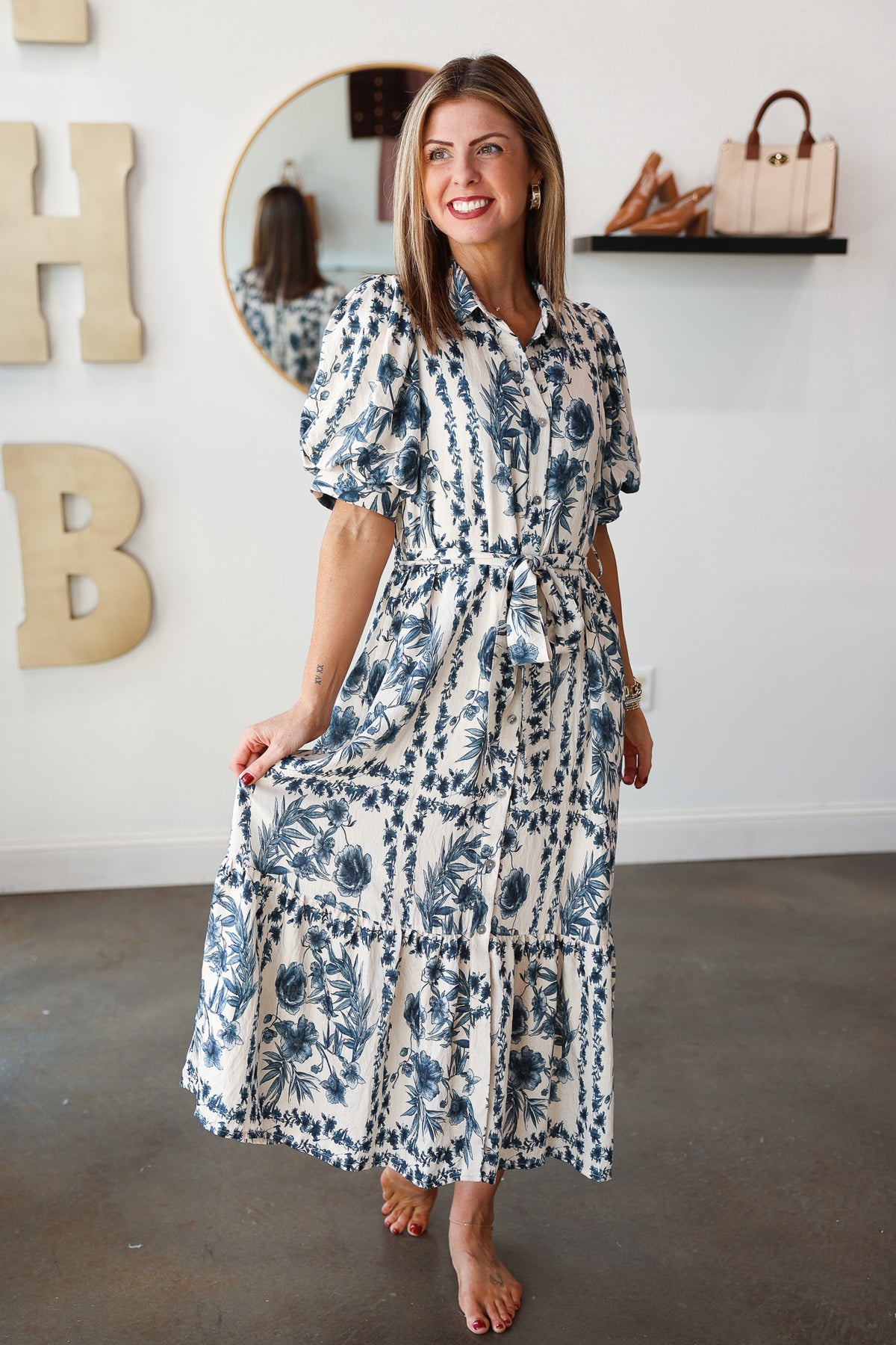 Embrace effortless elegance with our stunning Blue & Cream Floral Midi Dress. This charming piece features a captivating botanical print in serene blue hues against a crisp white background, perfect for adding a touch of sophisticated bohemian flair to your wardrobe. Its versatile design transitions seamlessly from casual daytime outings to more dressed-up occasions.