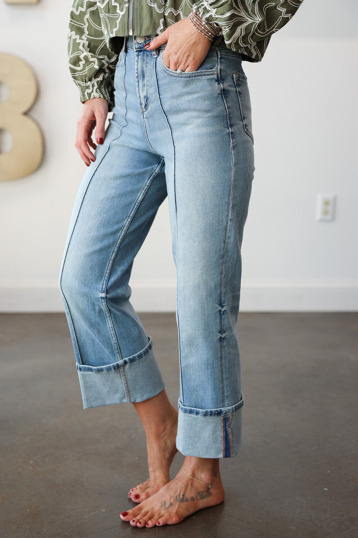 Designed for versatility, these jeans boast a relaxed wide-leg cut and a stylish cuffed hem that hits at a chic cropped length, ideal for showcasing your favorite footwear. Whether you're pairing them with sneakers for a casual day out or dressing them up with heels and a blouse for an evening out, these jeans are sure to become a wardrobe staple. Their gentle wash and soft fade give them a lived-in, vintage appeal without compromising on durability.