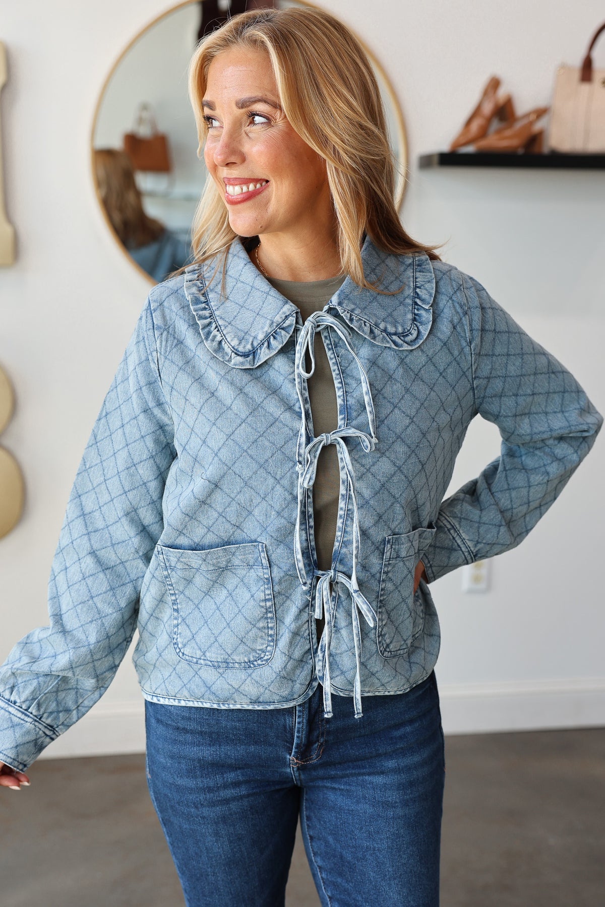 Elevate your casual wardrobe with our charming Quilted Denim Tie Front Jacket. This unique light wash denim-look shacket features an eye-catching diamond quilted pattern and a sweet, ruffled Peter Pan collar that adds a touch of vintage-inspired elegance. The distinctive tie-front closure allows for versatile styling, making it a standout piece for any fashion-forward individual. This jacket beautifully blends classic denim appeal with playful, sophisticated details.