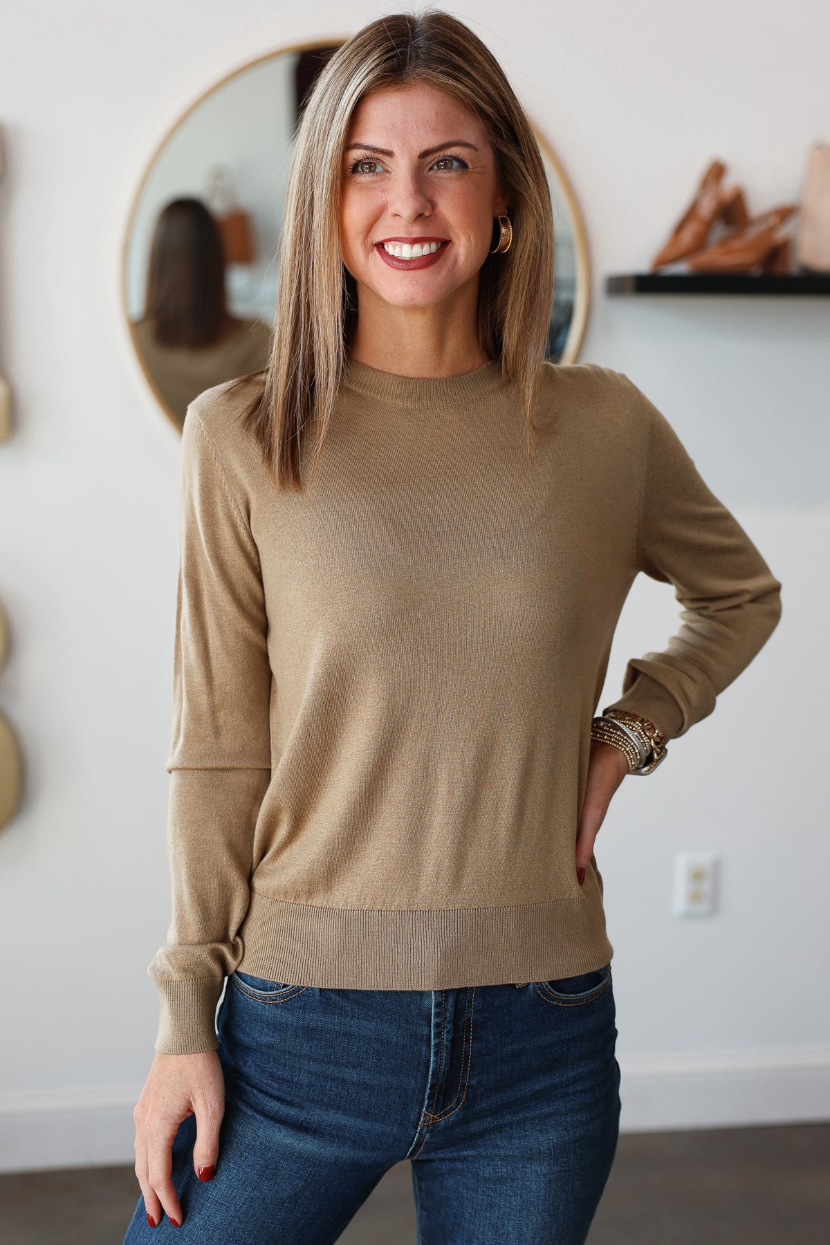 Crafted from a supremely soft and breathable fabric, this tan-colored sweater offers the perfect blend of comfort and style. Its delicate fine knit construction provides a sophisticated drape, making it an ideal choice for any season and countless occasions. You'll love its subtle sheen and smooth texture against your skin.