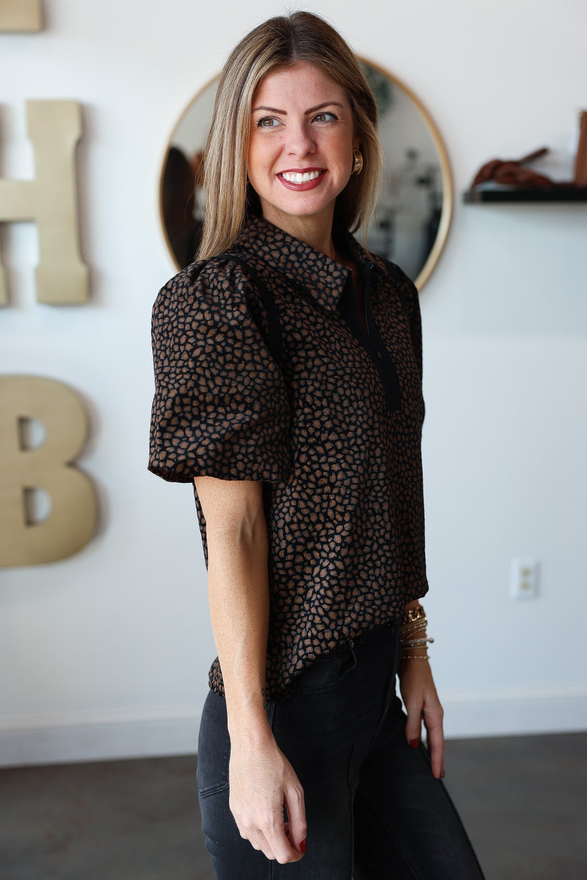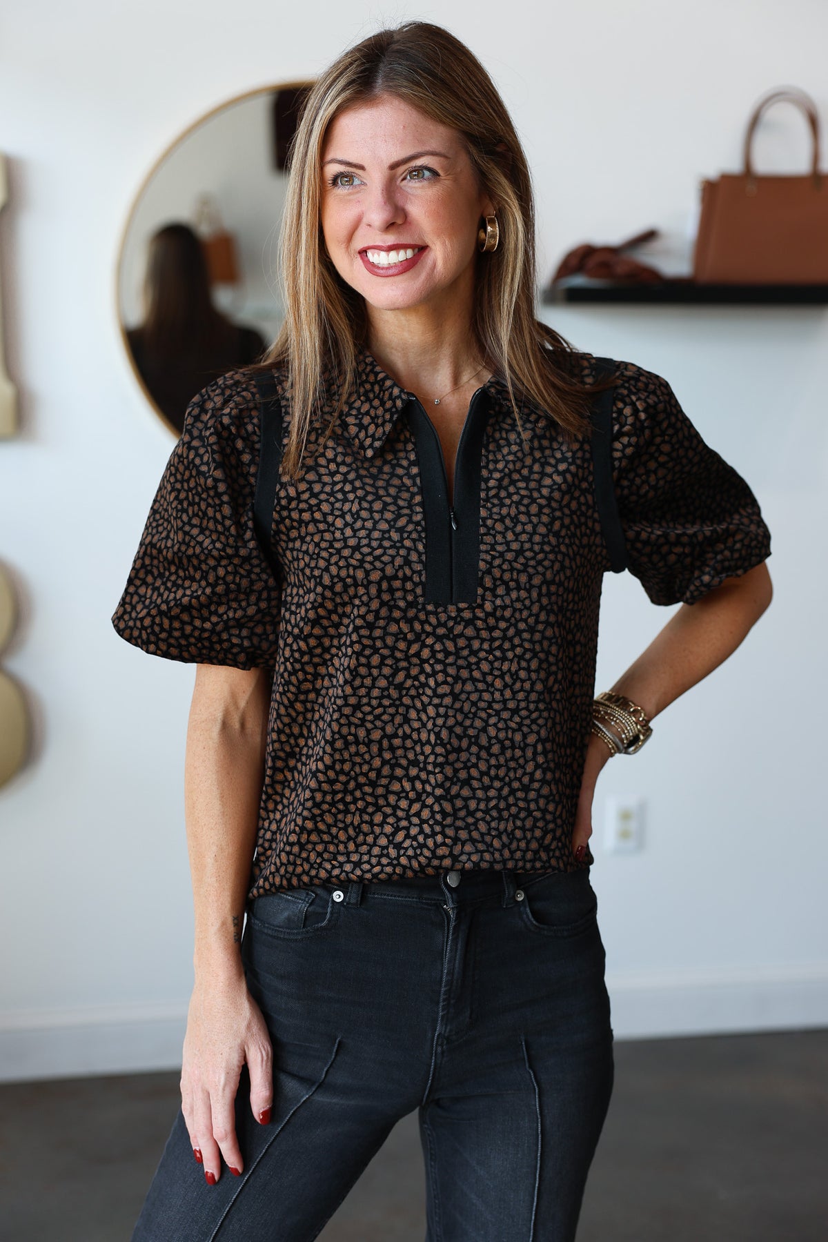 Quarter Zip Animal Print Top
