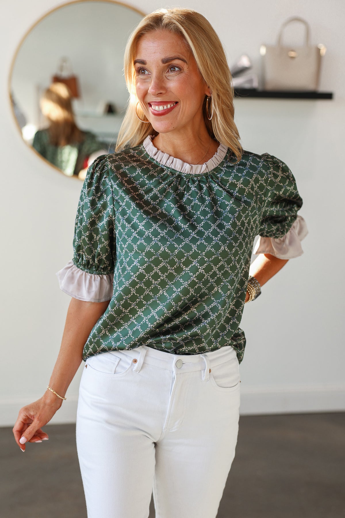 Ruffle Detail Printed Top - Olive