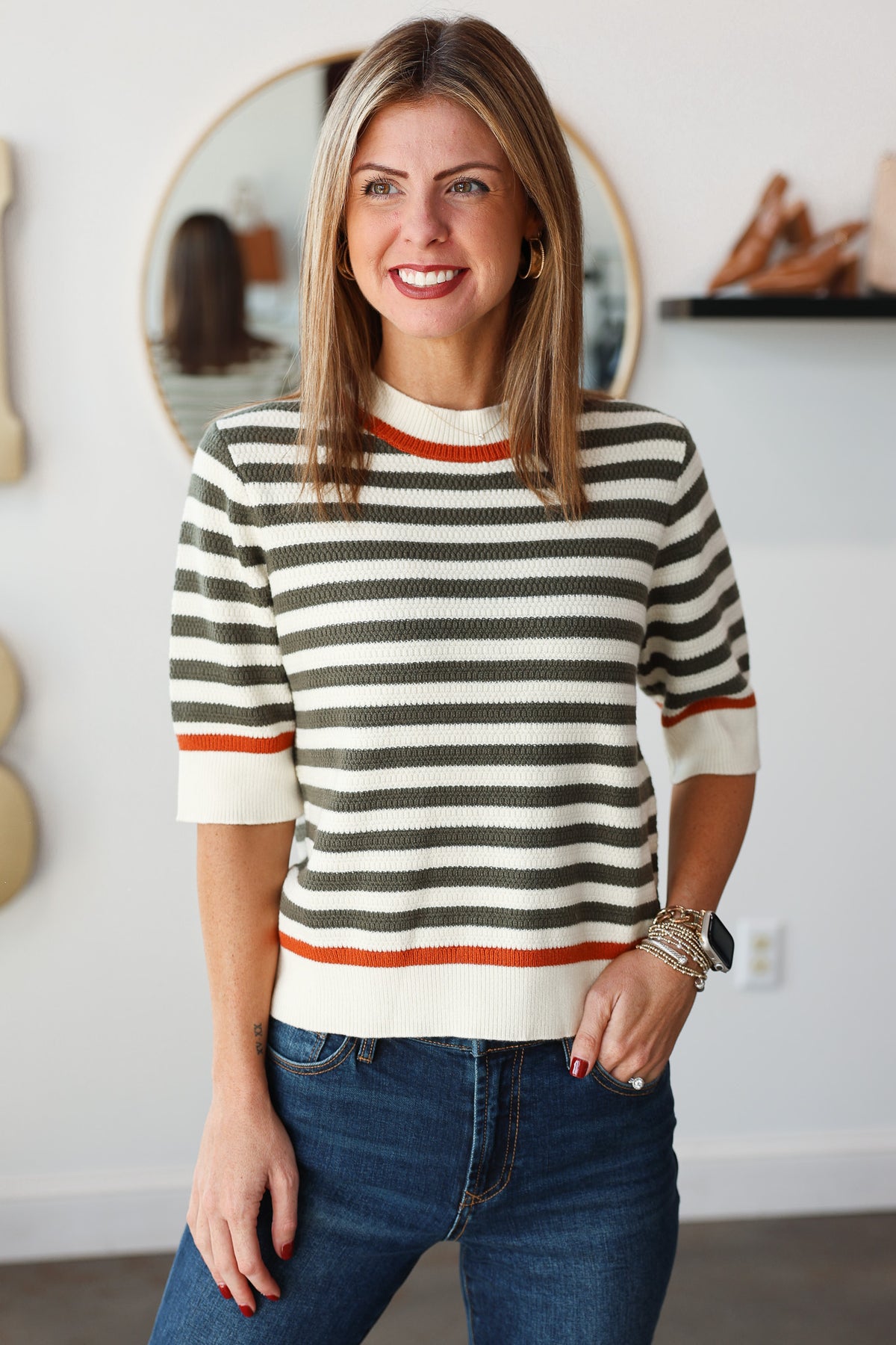 Elevate your everyday style with our chic Striped Short Sleeve Knit Sweater, a perfect blend of comfort and contemporary design. This versatile women's top features a captivating horizontal stripe pattern in sophisticated olive green and classic cream, accented with a subtle pop of burnt orange at the ribbed collar, cuffs, and hem. Its refined crew neck and elbow-length sleeves offer a polished yet relaxed silhouette, making it an ideal choice for a variety of occasions.