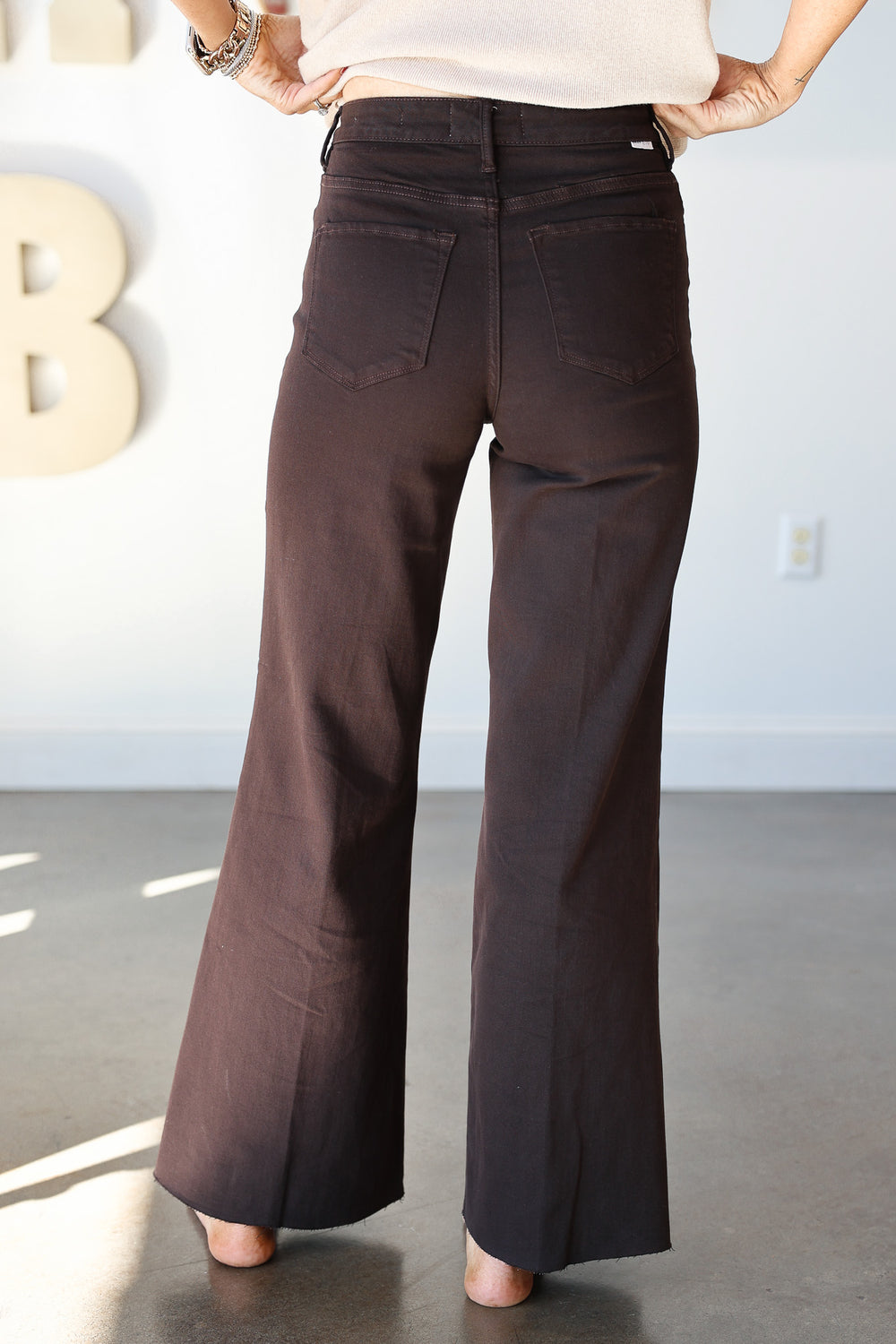 Elevate your everyday style with our chic High-Waisted Dark Brown Wide Leg Pants. These trendy trousers feature a flattering high-rise fit that elongates the leg. The rich, deep brown hue offers a sophisticated alternative to classic black or blue denim, making them a versatile staple for any wardrobe.