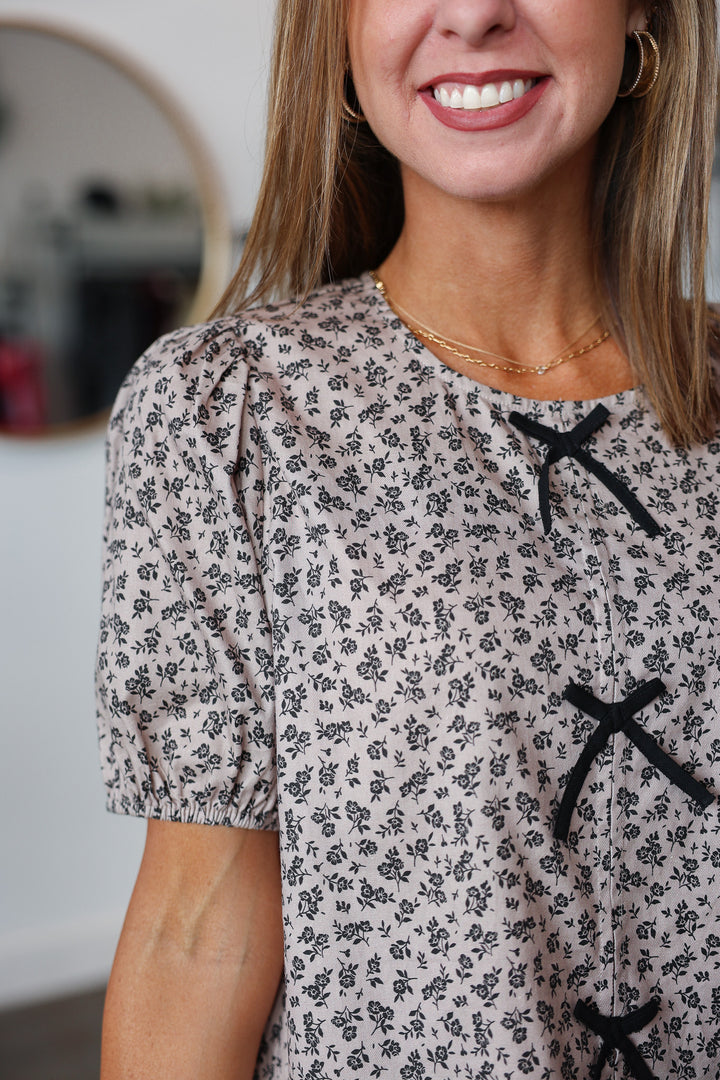 Bow Detail Floral Top - Stone/Black