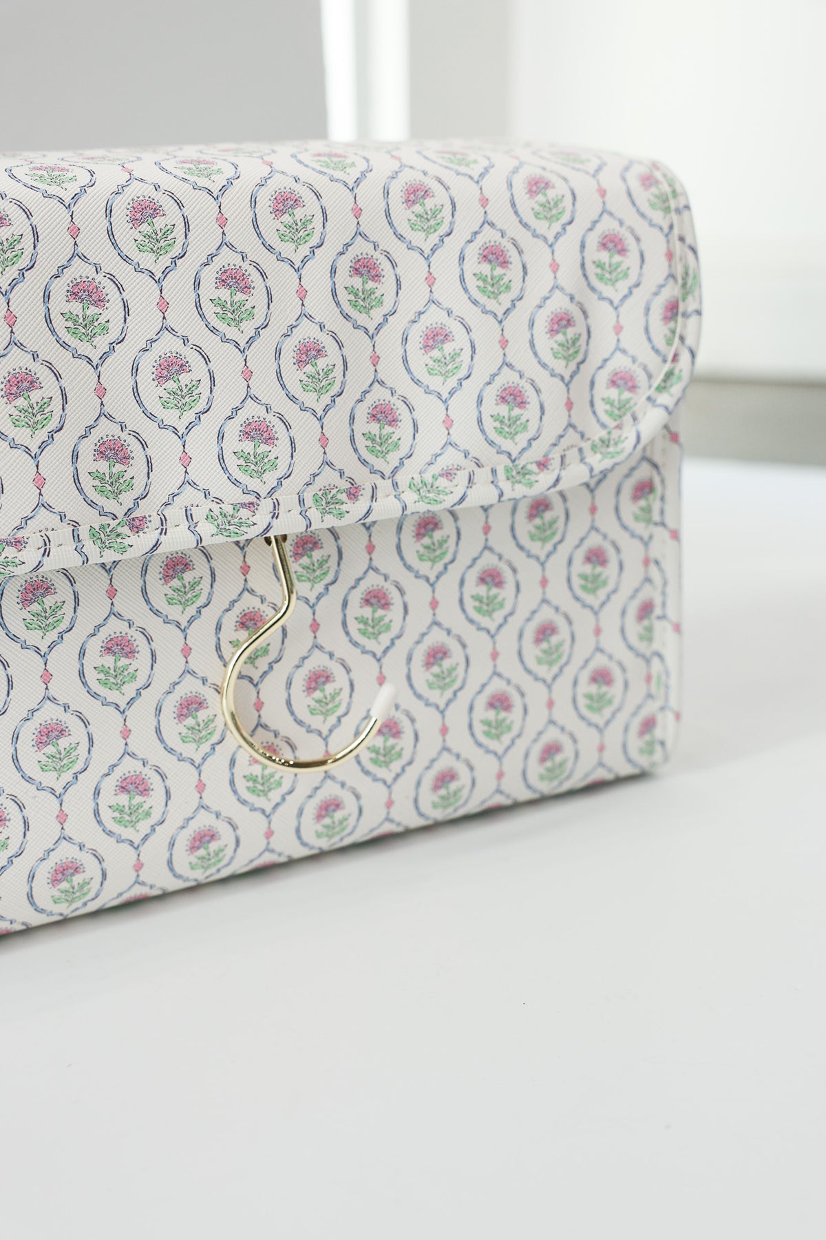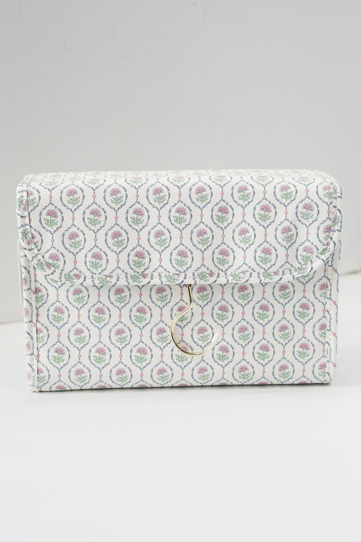 - Gold metal hook for hanging the toiletry kit