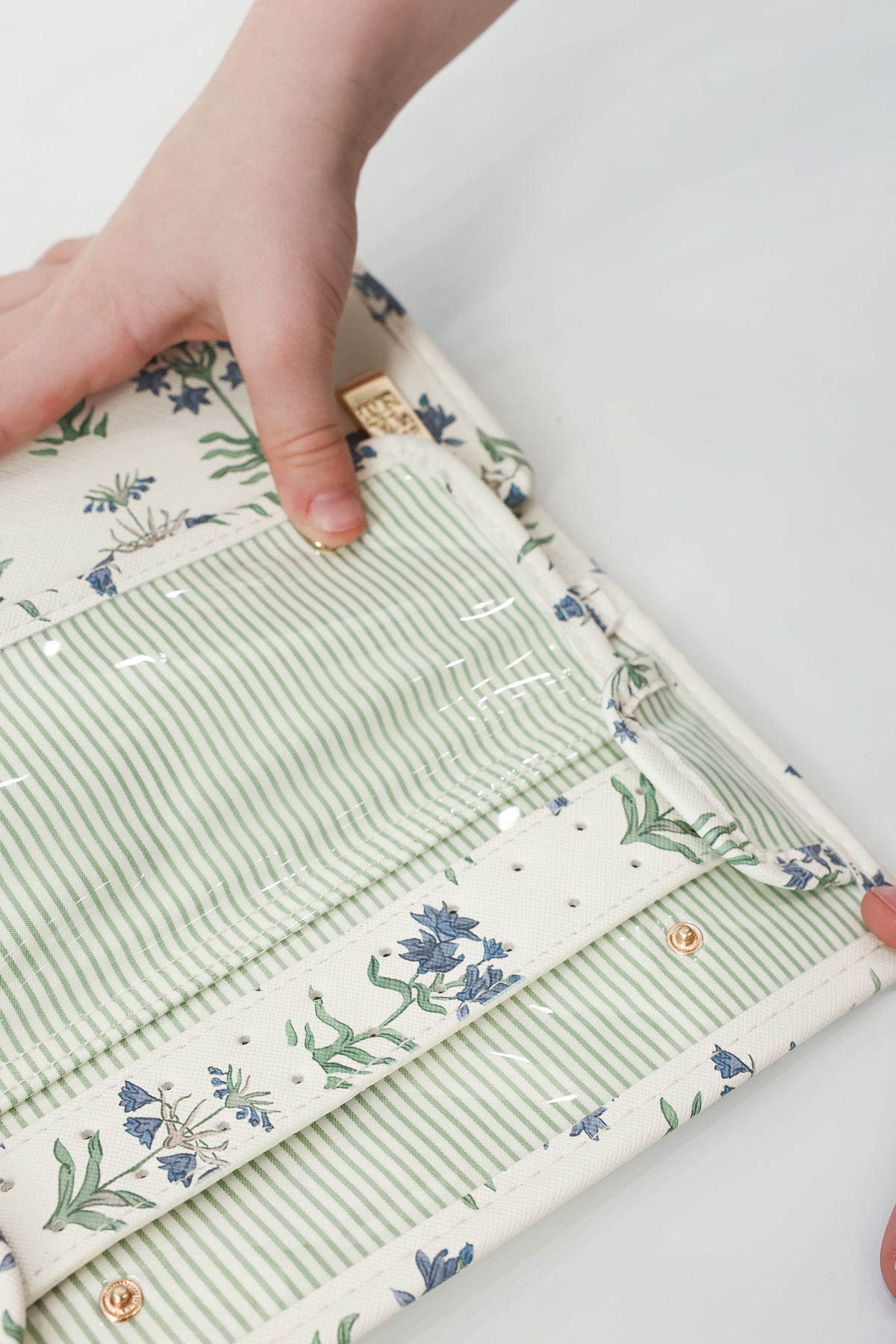 Attention globetrotters, take our Jewelry Wallet wherever you go while keeping your jewelry in place whether - business, leisure, and everything in between. Our sleek, high functioning wallet has 2 inside zip pockets, snap tabs for chains, a pendant pouch, ring roll and earring bar with a protective flap.