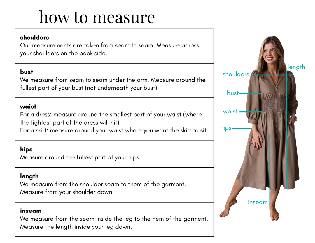 Check the last photo to see measurements for MOST items. If we missed something, just reach out! We're happy to get you measurements and offer sizing help. Refer to the image here to see how to properly measure.