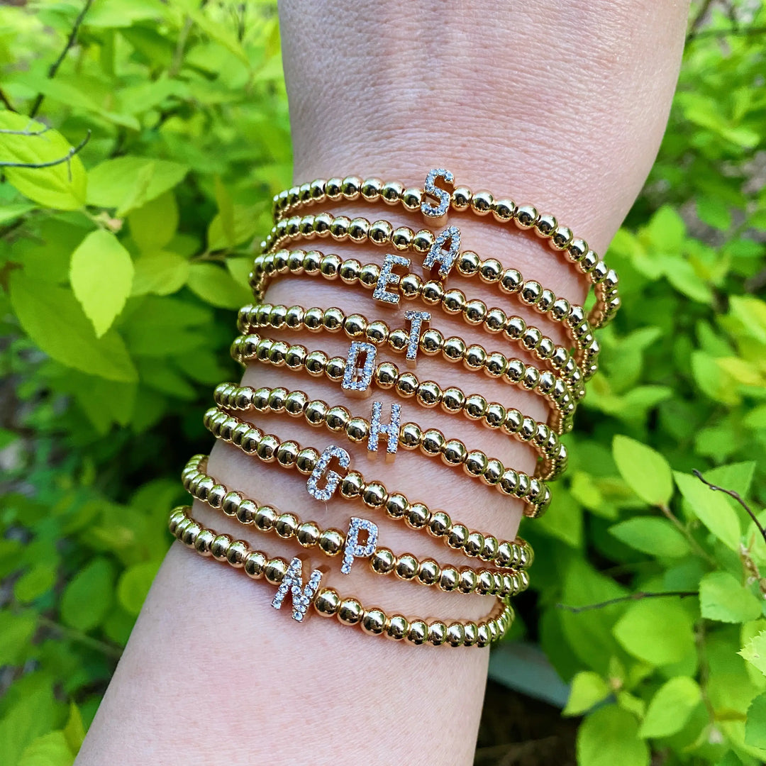 Stretch gold tone ball bead bracelet with sparkly small initial as an accent. Great to layer with other bracelets. Perimeter of the bracelet before stretch is 7". Gold ball bead 6 mm. Gold dipped brass
