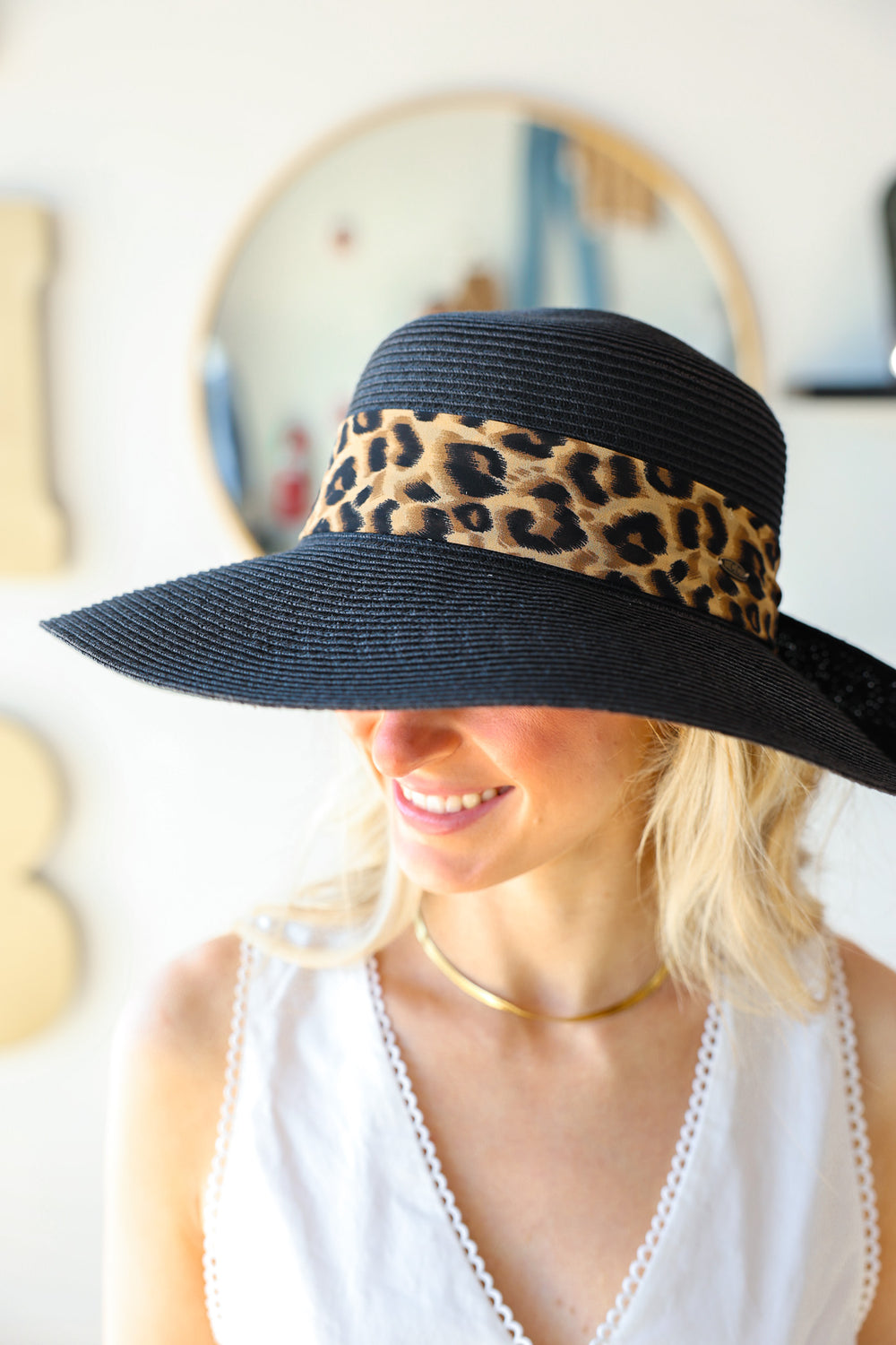 Leopard Print Ribbon Band Rolled Sun Hat - Black