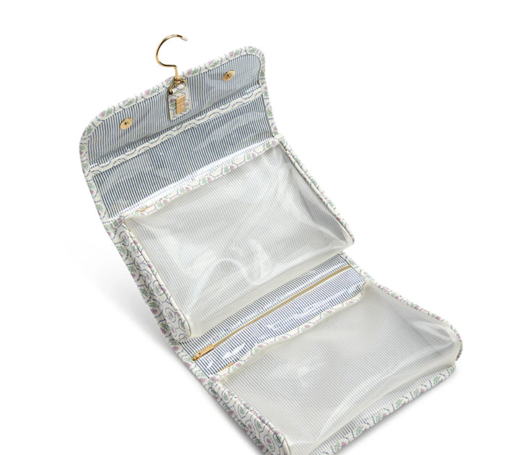 - Gold metal hook for hanging the toiletry kit