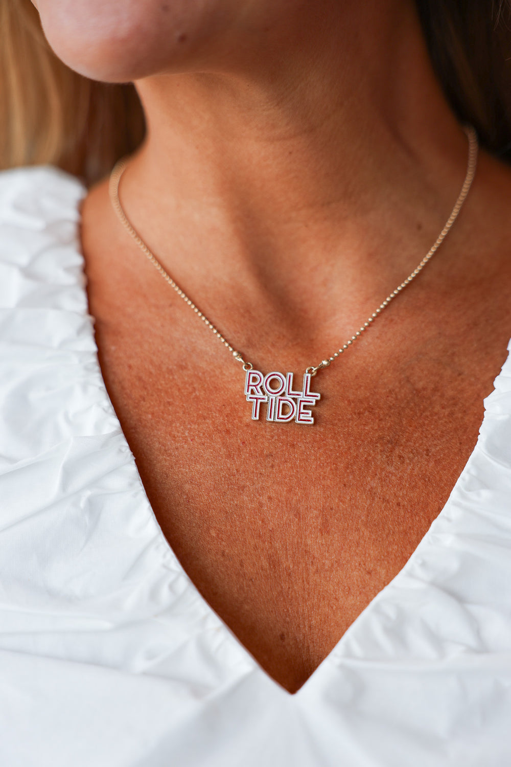 Show your team spirit with this fun Alabama Crimson Tide Outline Enamel Necklace in Crimson/White! Perfect for game day or any day, the "Roll Tide" design adds a playful touch to your outfit. Represent your team in style!