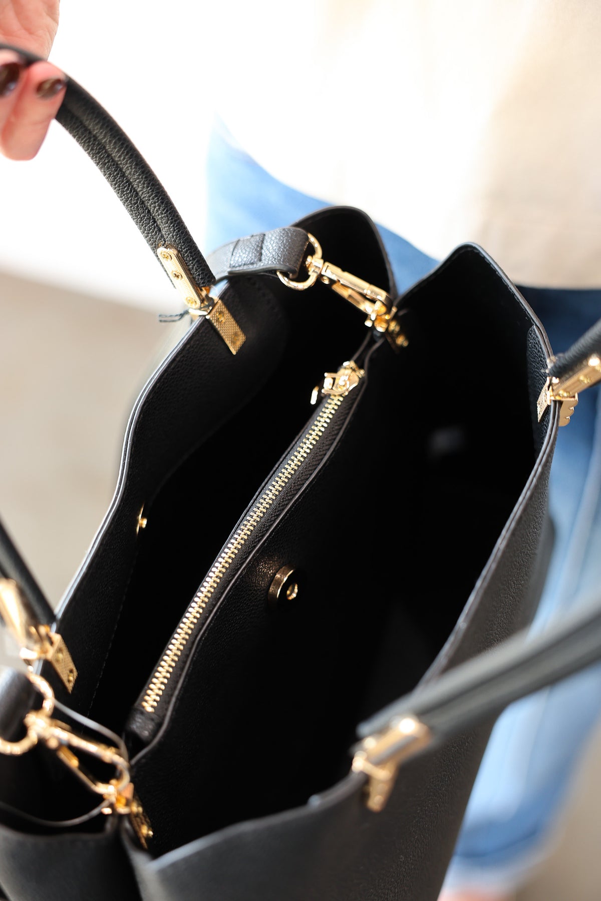 Crafted from high-quality pebbled faux leather, this tote offers a luxurious feel and durable wear. The spacious main compartment provides ample room for all your essentials, while sturdy top handles adorned with gleaming gold-tone hardware ensure comfortable carrying and add a touch of timeless elegance.